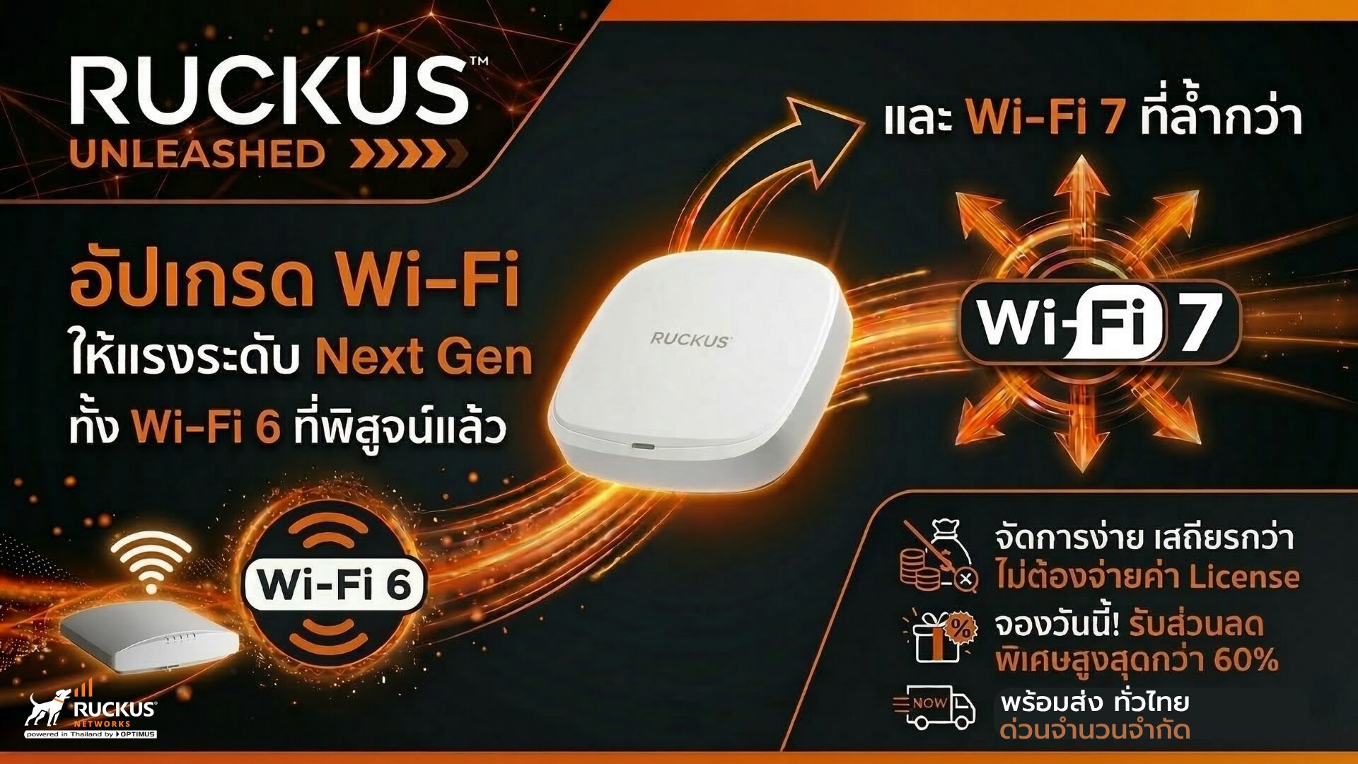 อัปเกรด Wi-Fi แรงระดับ Next Gen รองรับทั้ง Wi-Fi 6 และ Wi-Fi 7 เสถียรกว่า จัดการง่ายกว่า ด้วย Ruckus Unleashed พร้อมดีลสุดคุ้ม และของพร้อมส่งวันนี้! ทำไมต้อง Ruckus Unleashed Ruckus Unleashed Wi‑Fi ที่จะทำให้คุณพร้อมทั้ง “วันนี้” และ “วันข้างหน้า : จะมาตรฐาน Wi‑Fi 6 ที่องค์กรทั่วโลกไว้วางใจ หรือจะ Wi‑Fi 7 เจเนอเรชันใหม่ที่มาแรงสุดๆในวันนี้ เราก็มีโปรโมชั่นที่ใครๆก็อัปเกรดความแรงของ WiFi ในราคาสุดพิเศษ พร้อมมีของส่งทันที!! ทำไมทุกองค์กรถึงว๊าว กับ Ruckus Unleashed Controller‑less Solution ซื้อไปจบในตัว ไม่ต้องมีคอนโทรลเลอร์แยก ไม่ต้องซื้อLicen